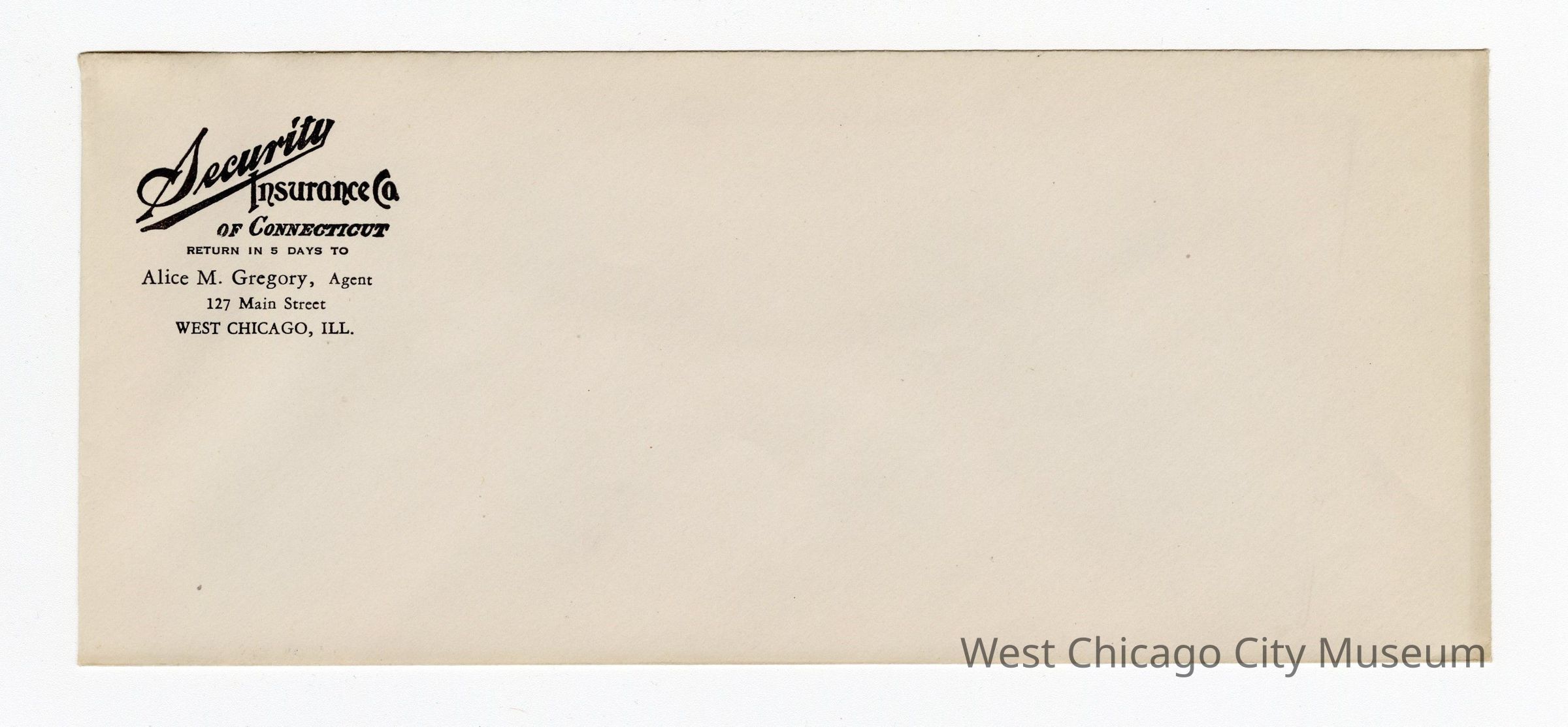 Envelope: front Alice M. Gregory, Agent Security Insurance Co. of Connecticute 127 Main Street