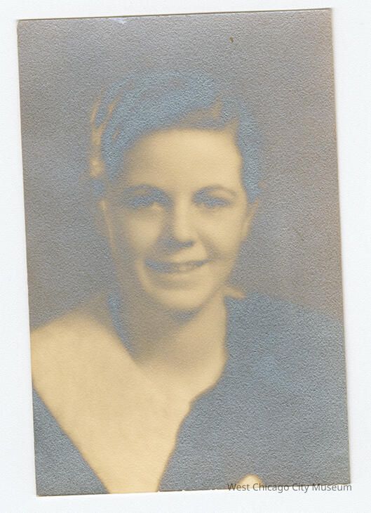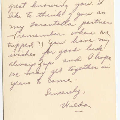 Photograph, likely Wilda Williams (later Shamrock). Shows a girl with her hair up and waved, smiling at the camera. Her clothing is dark on the right side, light on the left. On the back is a note to "Zappy" wishing her well in the future and reminiscing about when they were tarantella dance partners (and they tripped). 3 x 4.5 inches