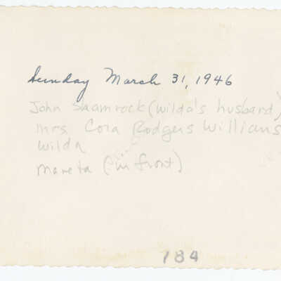 Photograph, black and white, portrait orientation. Shows the Williams family standing outside in spring, on the grass with bare trees in the background. Standing, left to right: John Shamrock, Cora Rogers Williams, and Wilda Williams Shamrock. In front, seated on the ground, Alice Mareta Williams Lindhorn. Photo has a deckle edge. On the back in pen is written "Sunday March 31, 1946". Below that, in pencil, is written identification of people in front.Photograph Details