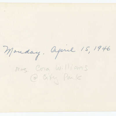 Photograph, black and white, portrait orientation. Shows the Cora Rogers Williams seated on a rustic bench made of branches outside in spring at "City Park" (presumably West Chicago), with bare trees in the background. 3.25x5.25" On the back in pen is written "Monday, April 15, 1946". Below that, in pencil, is written identification of front.Photograph Details