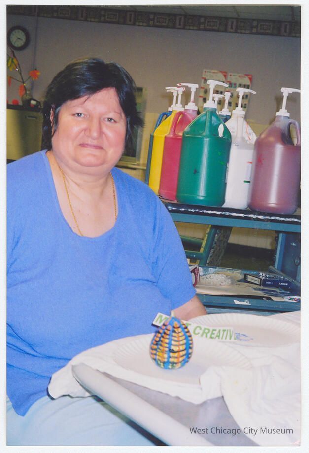 Photograph, 6x4 inches, showing a woman in a blue t-shirt and short hair, smiling at the camera. On the table in front of her is a painted egg with a printed tag "Most Creative." There are jugs of paint on a high table behind her. Photo taken at West Chicago Terrace, during the Pumpkin Decorating Contest. c. 2003.