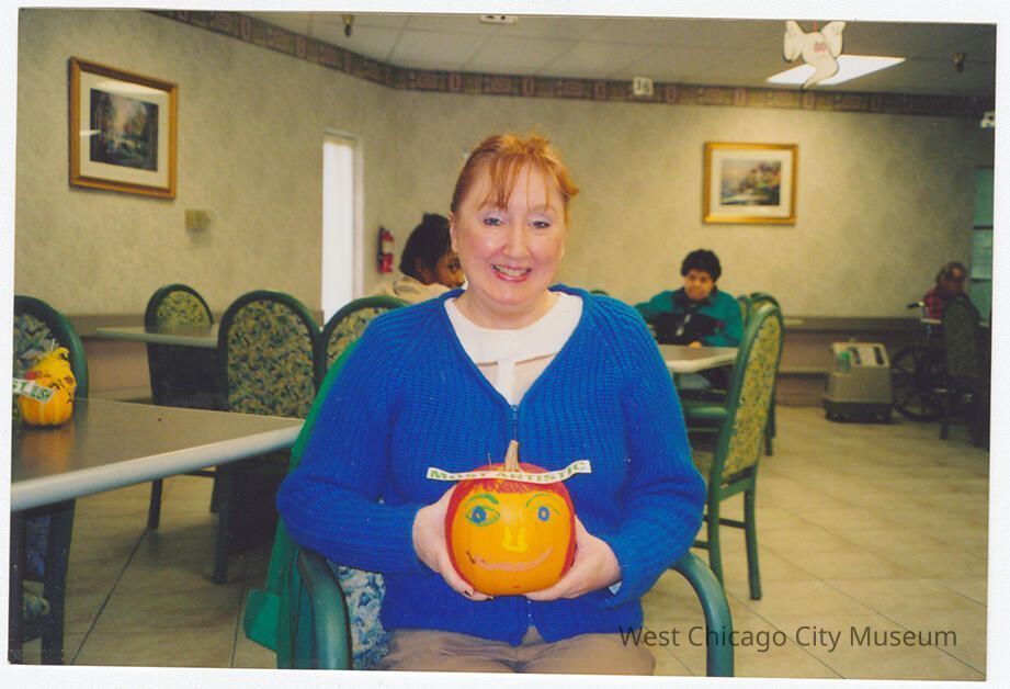 Photograph, 6x4 inches, showing a seated woman in a blue sweater and pulled up reddish hair with bangs, holding a painted pumpkin that has a tag that reads "Most Artistic" on top. Photo taken at West Chicago Terrace, during the Pumpkin Decorating Contest. c. 2003.
