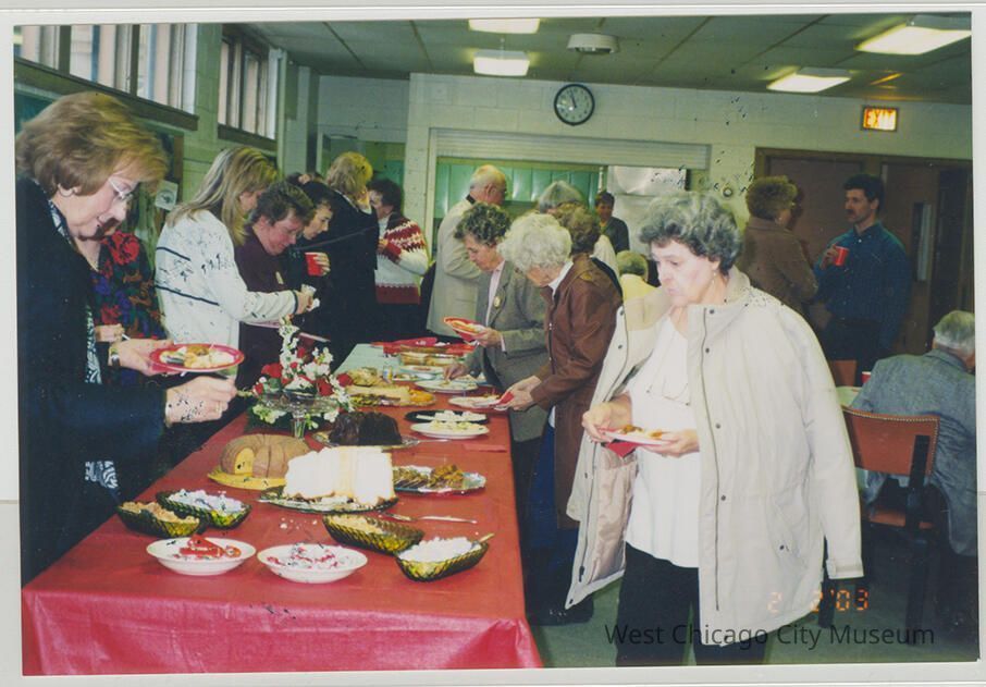 Photograph, color, Welcome Reception for Pastor Todd Yonkman, February 2, 2003. Shows a large group, mostly women, filling plates at a long tale with appetizers and desserts. Table has a red tablecloth and a centerpiece of red and white flowers. Back of the photo has the following names in black marker: Matt Bair, Chuck Schramer, Jan Fick, Howard Born, Barb Strayve, Kristy Bair and Karen Warkentin.