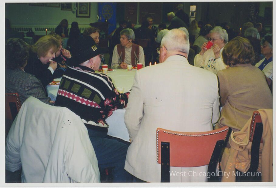 Photograph, color, Welcome Reception for Pastor Todd Yonkman, February 2, 2003. Shows round tables full of older people enjoying their food. Names are written on the back in blue marker - Norma Smith, Dode Metzger, Marian Siekmann, Charlotte Almond, Donna Sandberg, Howard Born, Betty Duriavich, Barb Reed, Karen Warkentin, Fran Cain. There is marker residue on the front of the photo, from being set on wet marker.