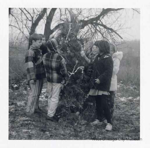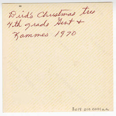 Indian Knoll School photos, black and white, square - shows a group of children in coats, decorating a tree with popcorn garland. Back reads "Bird's [sic] Christmas tree 4th grade Gent & Kammes 1970"