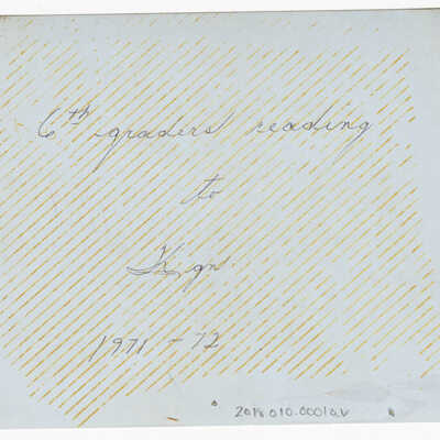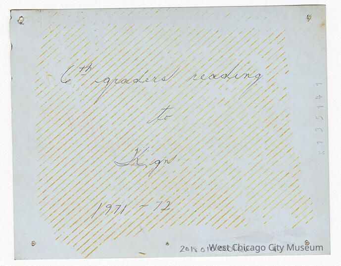 Indian Knoll School photos, black and white, rectangle - Shows children seated on an oval braided rug, older students reading to smaller ones. There is a girl with braided pigtails on the right side of the rug. Back reads "6th graders reading to Kgn 1971-72"
