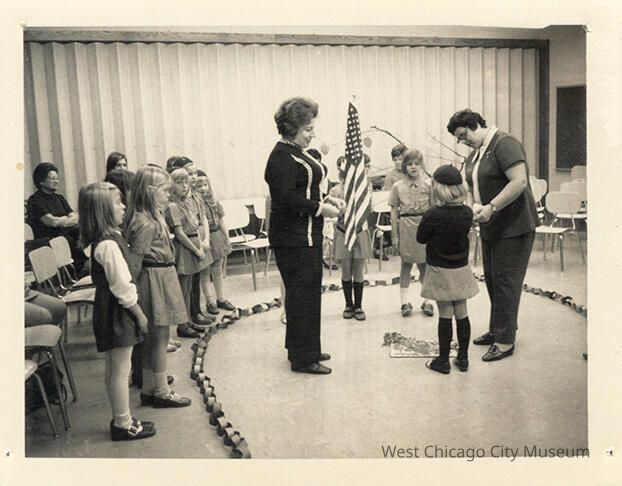 Indian Knoll School photos, black and white, rectangle - Shows a group of Brownie girl scouts with two instructors, possibly doing a flag or bridging ceremony. One girl holds an American flag on a pole. Ceremony is in a paper chain circle, and there are two rows of chairs around it. There are other adult women sitting in the back left.