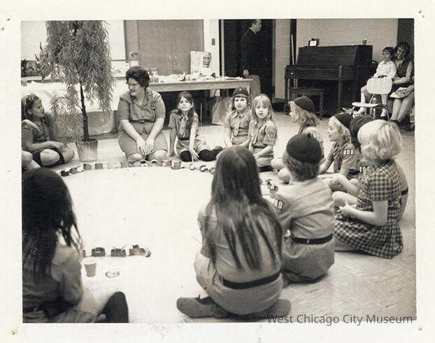 Indian Knoll School photos, black and white, rectangle - Shows a group of Brownie girl scouts, seated on the floor on the outside of a paper chain circle. It appears the curls are from two different troops - "800" and "668" are visible on some of the uniforms.