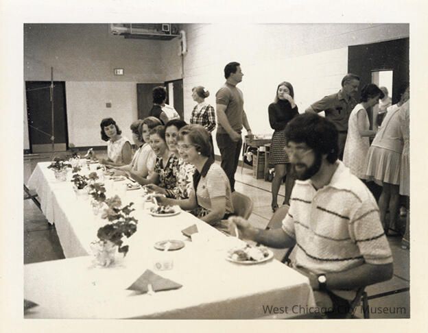 Indian Knoll School photos, black and white, rectangle - shows adults (probably teachers) seated at a long rectangular table, eating. To the right, there is a line to (presumably) the buffet. Back reads "June Luncheon 1972" Mrs. Nelson is seated in center of table, with dark hair.