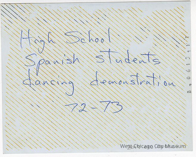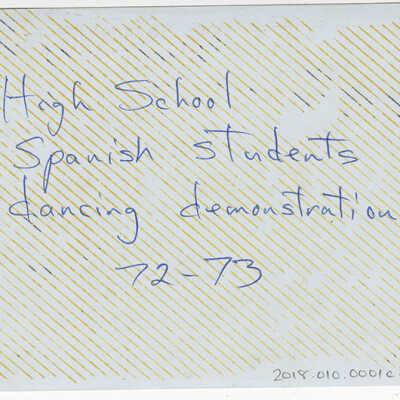 Indian Knoll School photos, black and white, rectangle - Shows 3 students, 2 boys and a girl, dancing with a dark haired woman in a dark fringed skirt. Other students seated on the floor, watching. Back reads "High School Spanish students dancing demonstration 72-73"