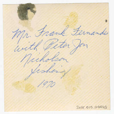 Indian Knoll School photos, black and white, square - Shows a small blond boy in a striped shirt with an older man behind him, holding up a tiny fish on a fishing line. Other boys and an adult are fishing to the right behind. They are along a pond to the left. Back reads "Mr. Frank Fernandes with Peter Jon Nicholson fishing 1970"