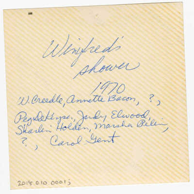 Indian Knoll School photos, black and white, square - shows a party with adult women, there are wrapped presents piled on a round table. Back reads "Winifred's shower 1970. W. Creedle, Annette Bacon, ?, Peg DeKeyser, Judy Elwood, Sharlin Holden, Marsha Pelin, ?, Carol Gent"Photograph Details