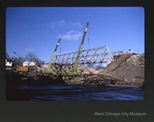 Slide, color, showing deconstruction of Wilson Street bridge. Landscape orientation. Shows 2 green cranes working on a truss bridge. The bridge is over dry land, and trucks are below it. The slide holder is white, and marked "4" in the upper left corner, and embossed "Jul 87"