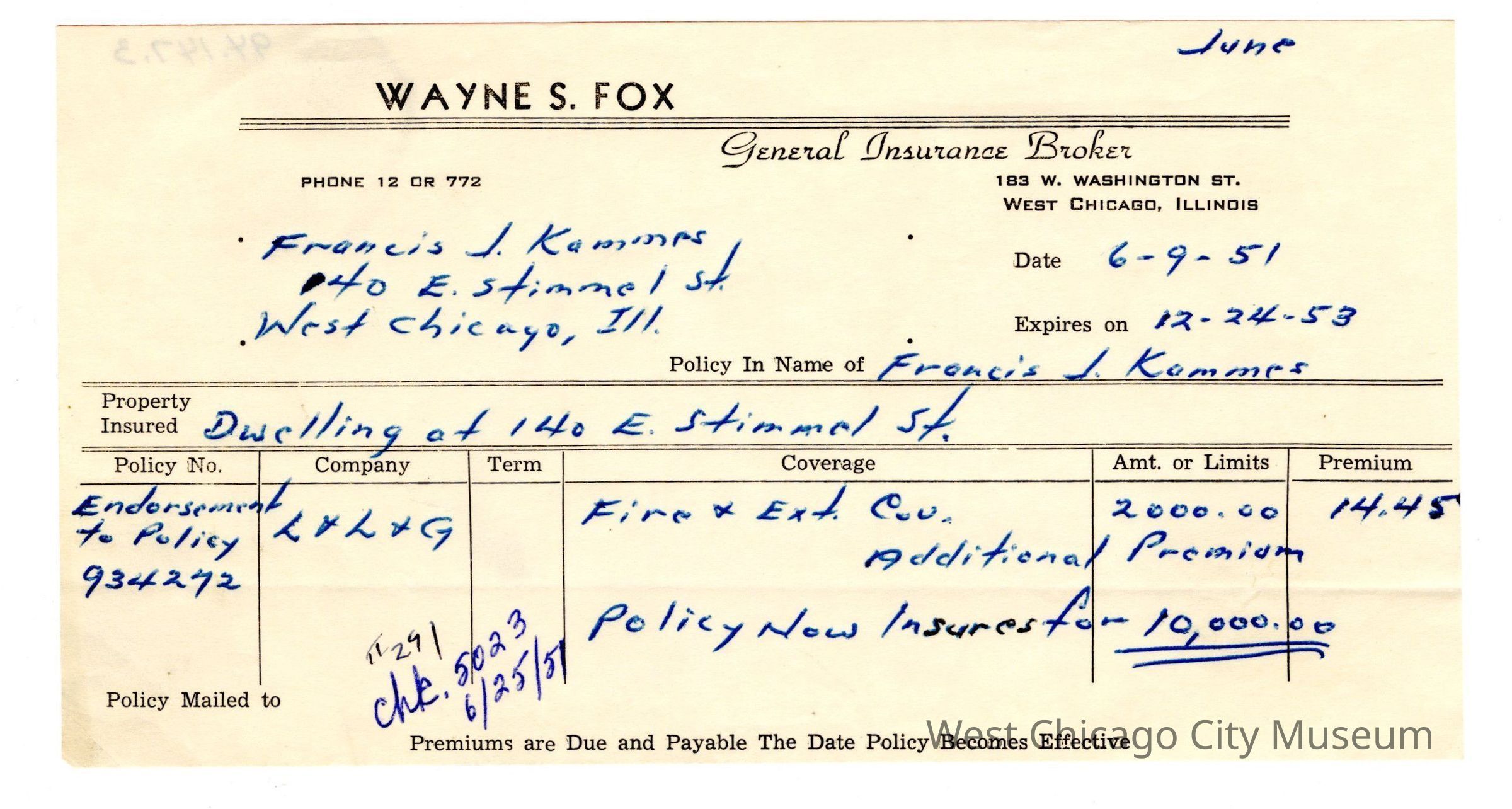Statement, Wayne S. Fox, General Insurance Broker, written to Francis Kammes, endorsement to policy, dated 6/9/51. 4 1/4" x 8"Collection