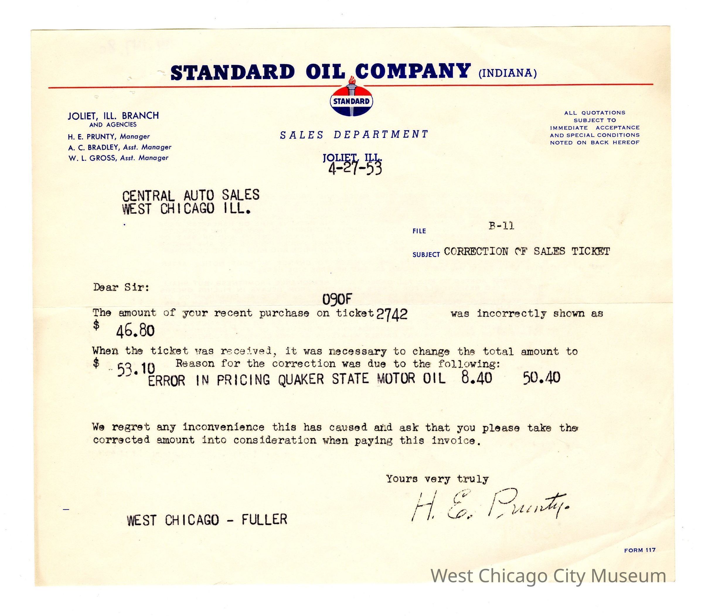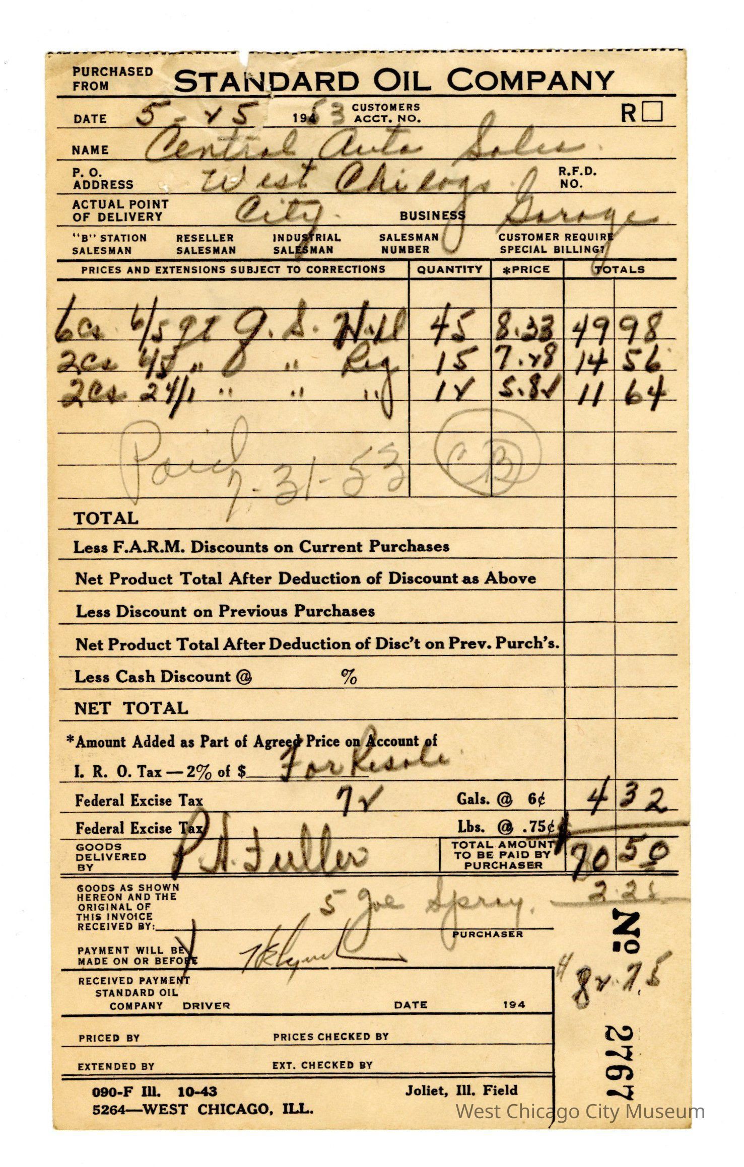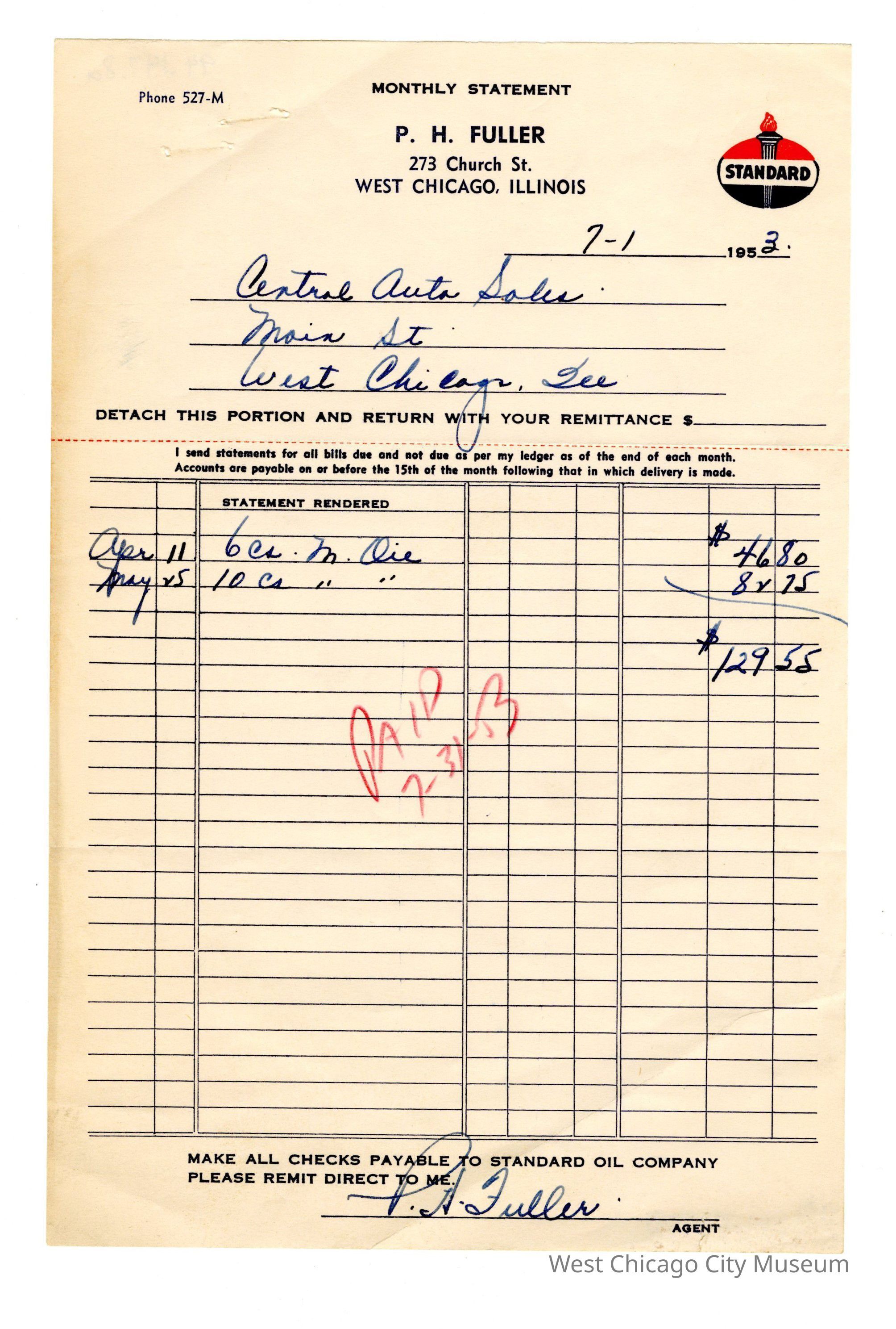 Statement, P.H. Fuller Standard Oil, to Central Auto Sales, 7/1/53, attached to statement are receipts (4) and coorection of sales tickets (2)Collection