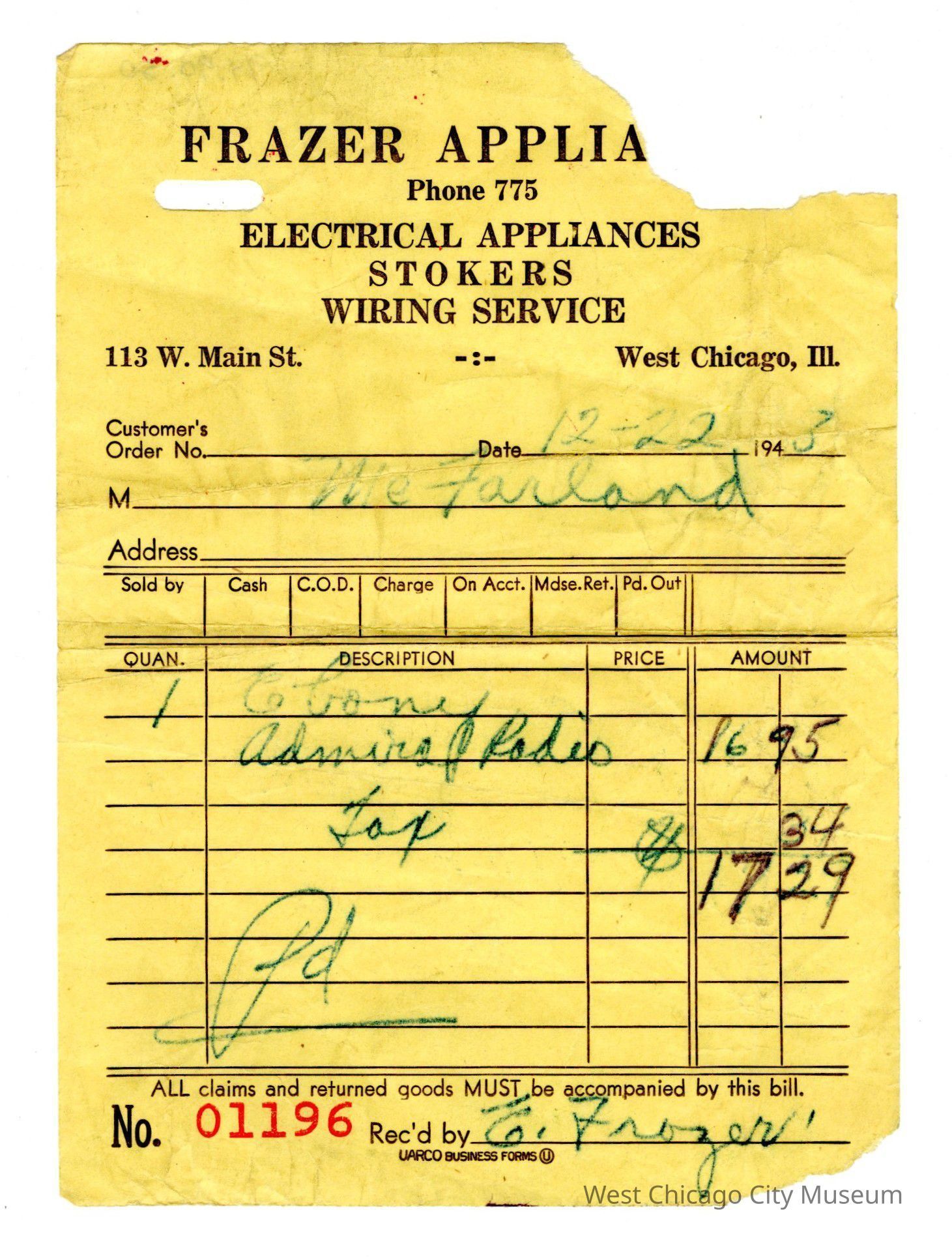 Receipt, Frazer Appliances, 12/22/43 to McFarland-1 chrome Admiral Radio-17.29 paid-top right corner ripped off, yellow-6" x 4 3/8"Collection
