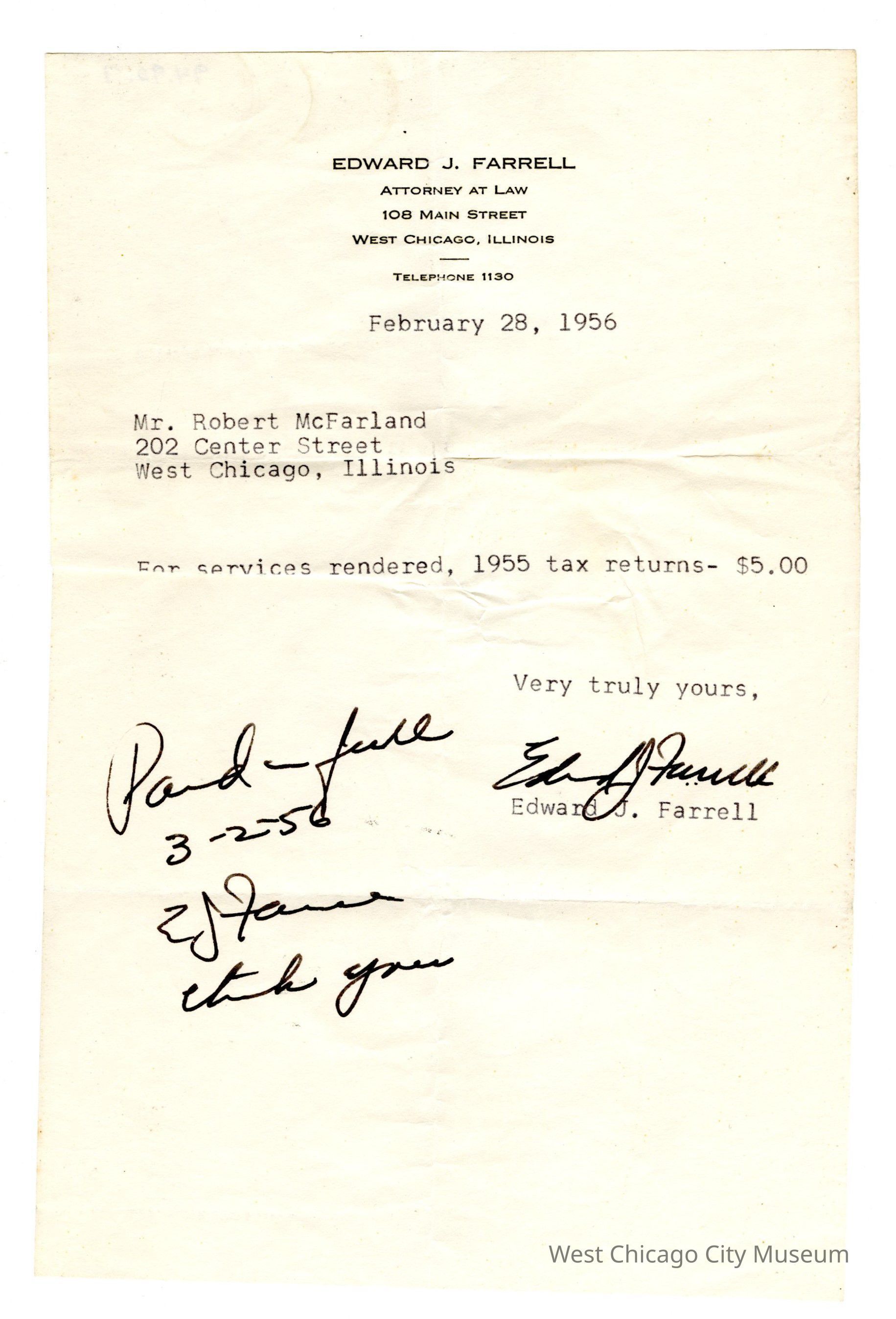 Bill, typed, from Edward J. Farrell, Attorney at Law, to Mr. Robert McFarland, for services rendered. 1955 Tax returns-$5.00. Written in pen "Paid in Full 3-2-56 E. Farrell Thank you"-8/5/16" x 5 1/2"Collection