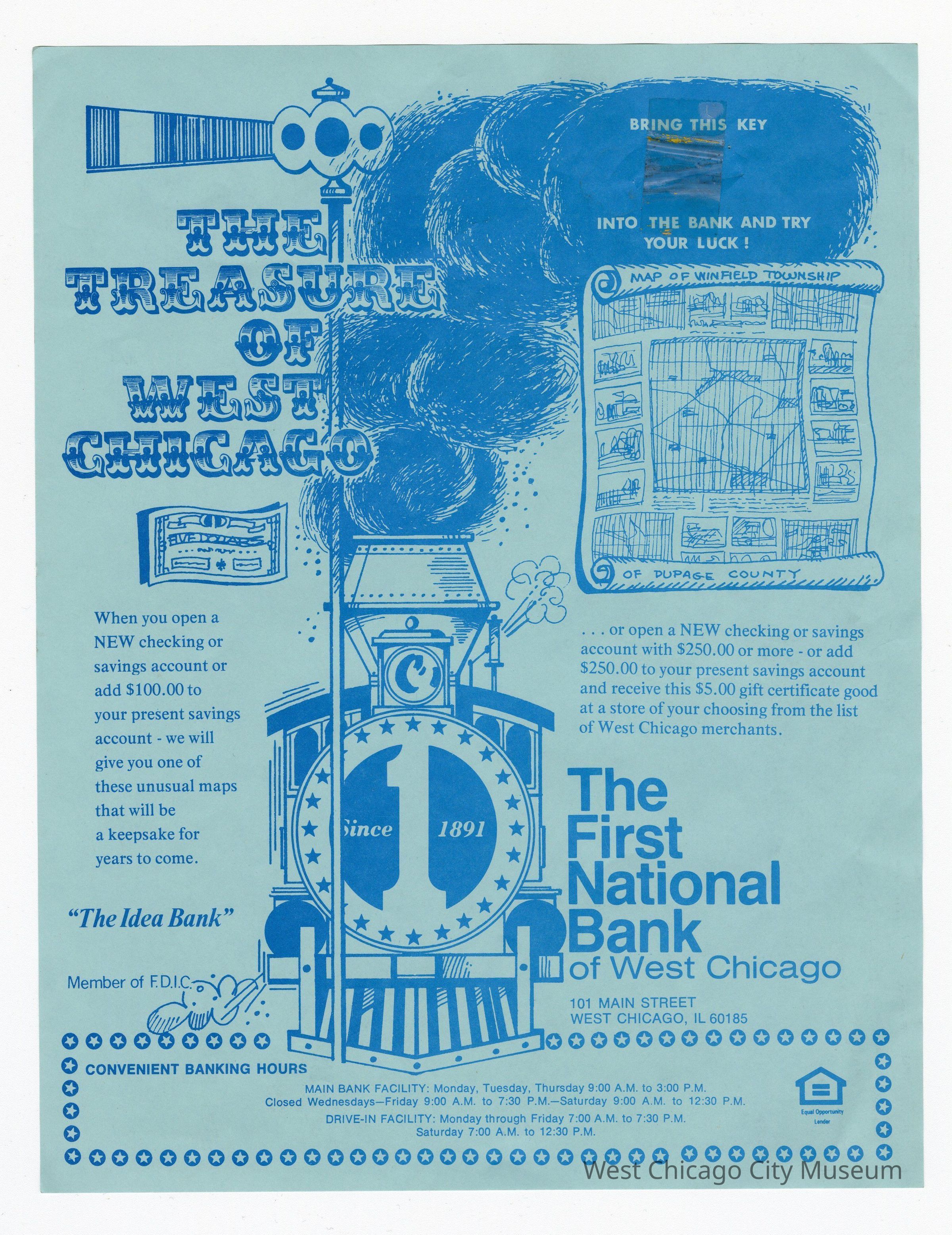 Poster: First National Bank, 101 Main Street, light blue paper with dark blue print, train with "1" Since 1891 on front, The Treasure of West Chicago, map of Winfield Township, upper right hand corner "Bring this key into the bank and try your luck!" with tapeCollection