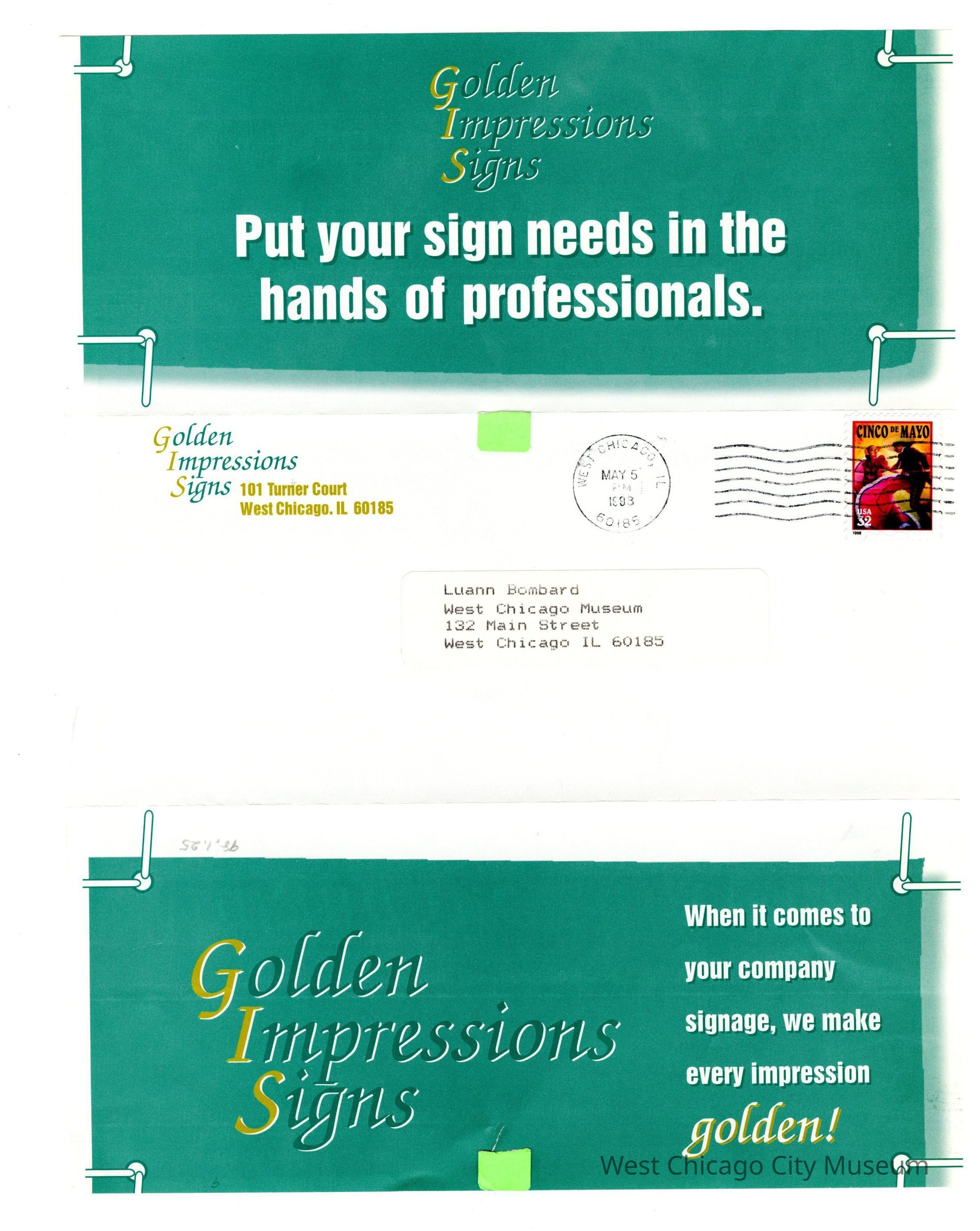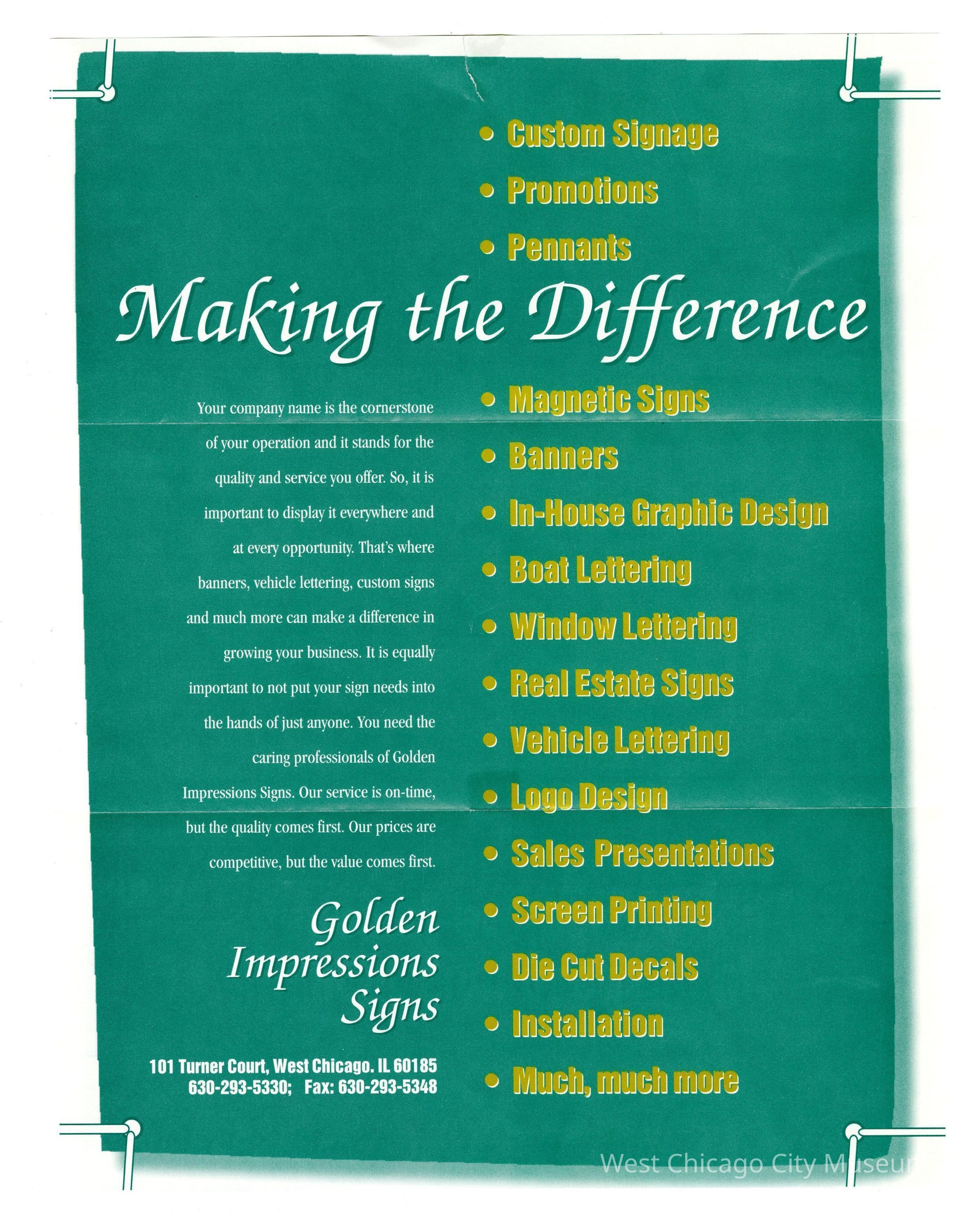 Flyer, trifold-Golden Impression Signs, 101 Turner Court, West Chicago. List of services. Green background with white and yellow print, 8 1/2" x 11"Collection