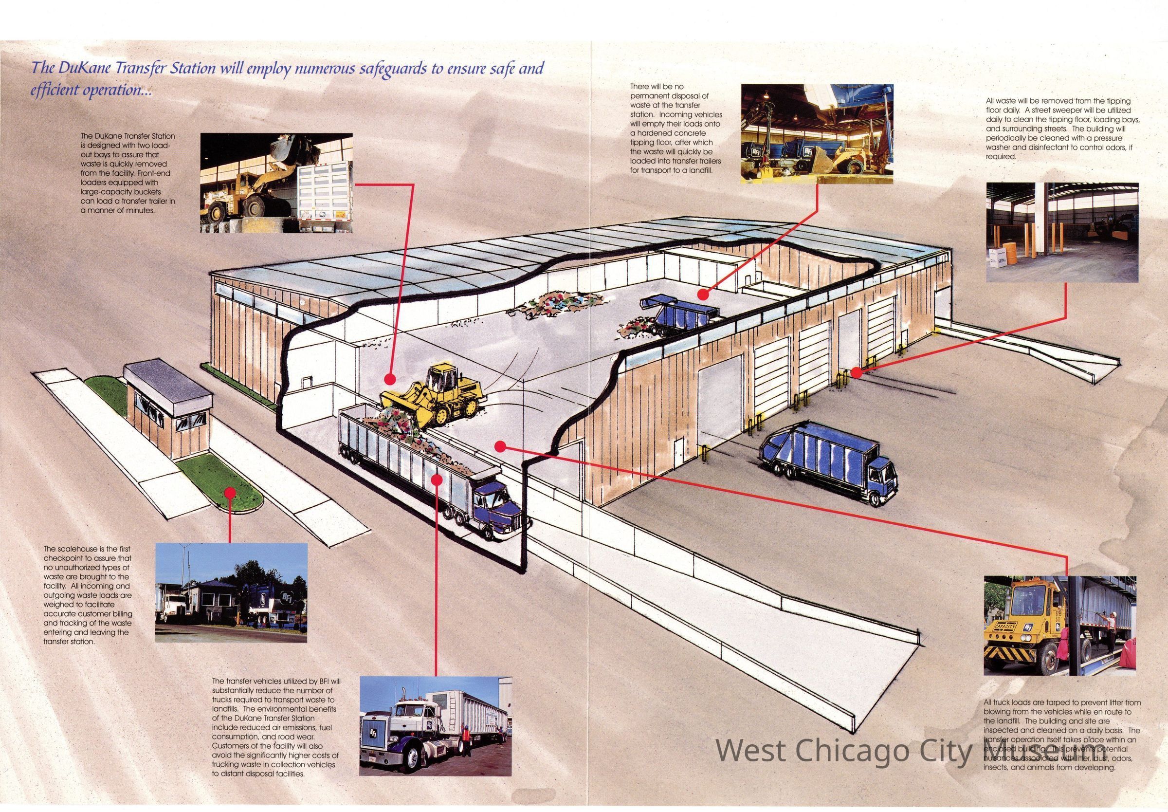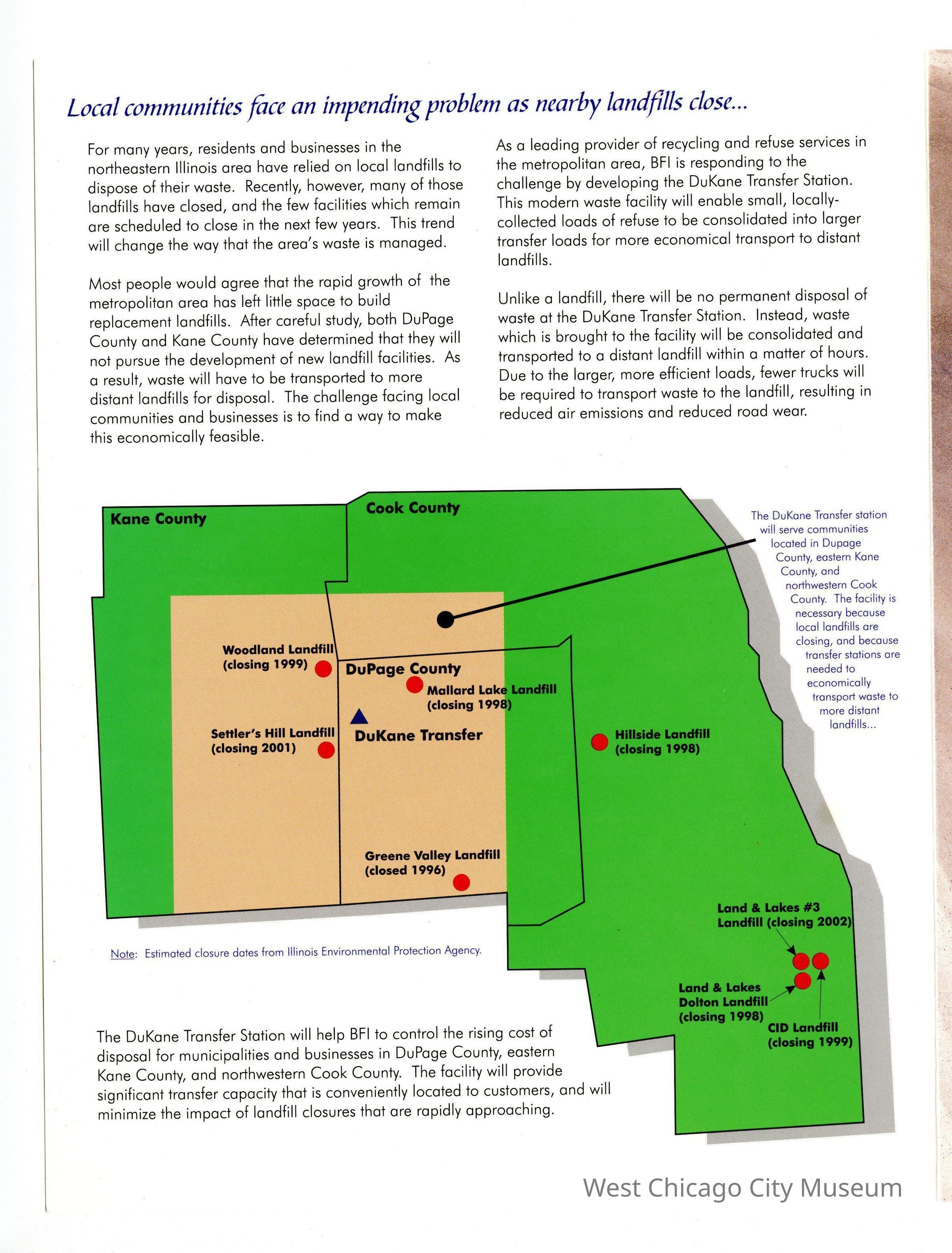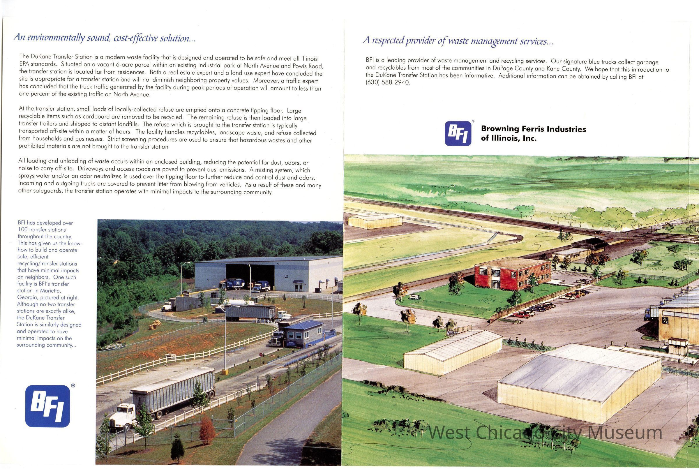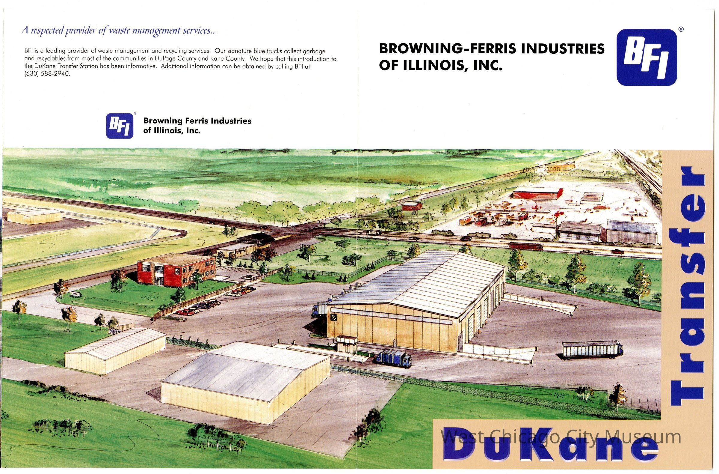 Flyer, trifold, Dukane Transfer of Browning-Ferris Industries of Illinois, Inc. Color picture of transfer station on cover. Blue, black print, 8 1/2" x 11"Collection