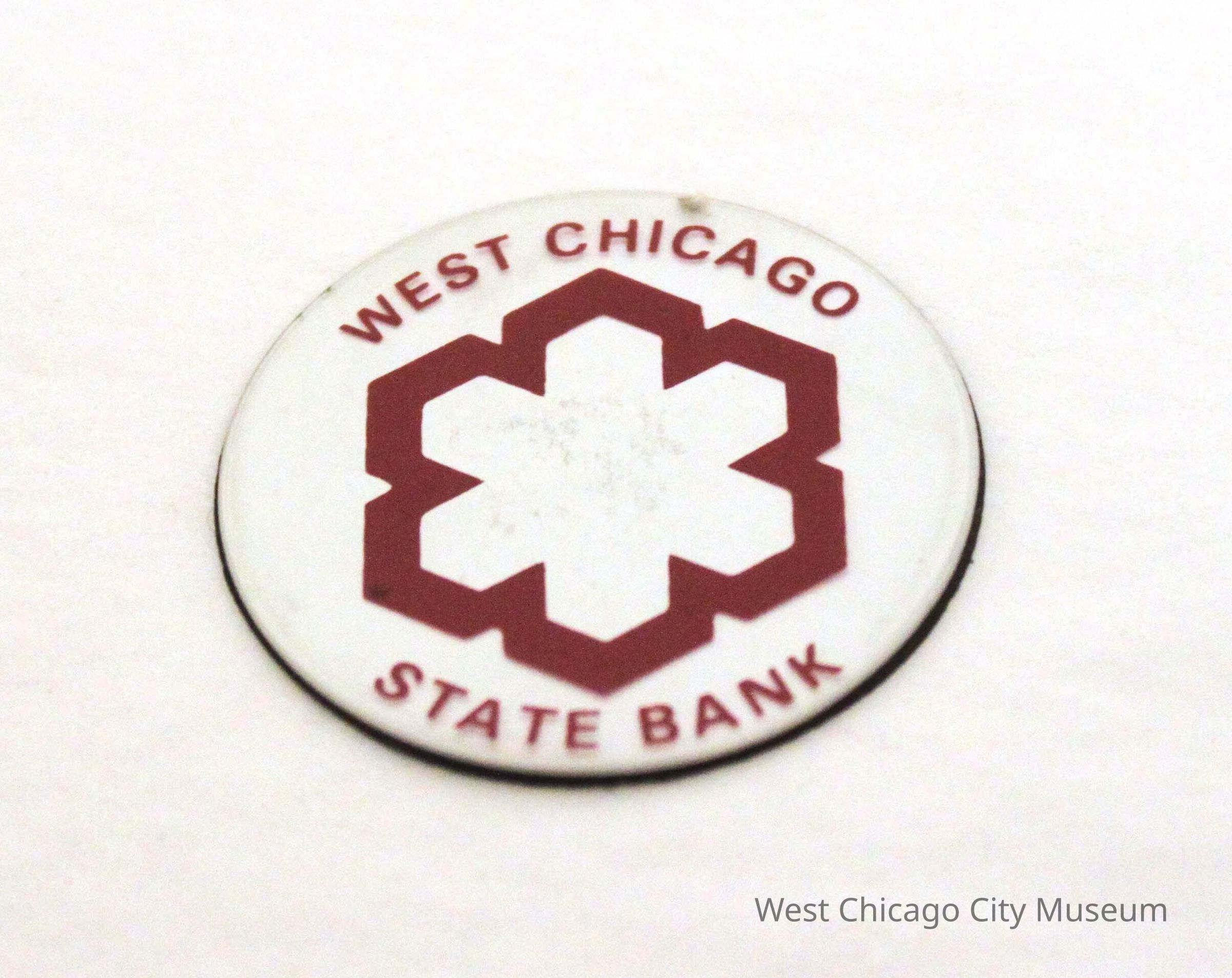 Round, flat Magnet that reads "West Chicago State Bank" in red, with an 6 pointed snowflake-like design outline.Use