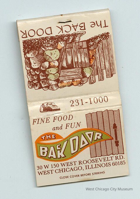 Matchbook, white with brown, green and orange print, advertising The Back Door, located at 30W150 West Roosevelt Rd, West Chicago. Inside cover has a map of the area (from Aurora to Elmhurst) with the Back Door marked. The heads of the matches have been trimmed off.Lexicon