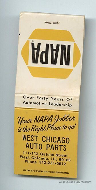 Matchbook, white and yellow cover with black print, advertising NAPA West Chicago Auto Parts at 111-113 Galena Street, West Chicago. The heads of the matches have been trimmed off.