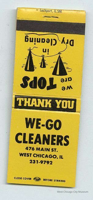 Matchbook, yellow cover with black print, advertising We-Go Cleaners at 476 Main Street, West Chicago. Back reads "We are TOPS in Dry Cleaning". The heads of matches have been trimmed off.