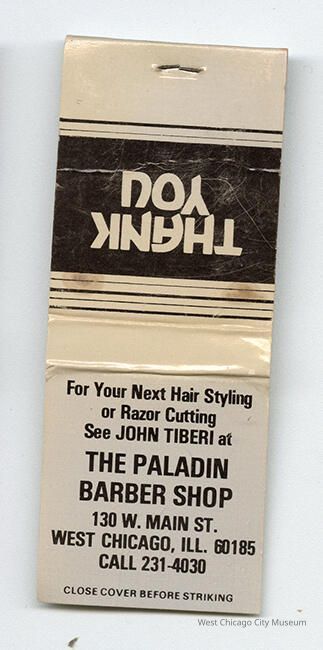 Matchbook, pale blue cover with black print, advertising John Tiberi at The Paladin Barber Shop, 130 W. Main Street, West Chicago. The heads of the matches have been trimmed off.Made/Created