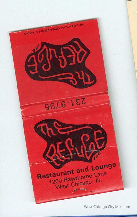 Matchbook, red cover with black print, advertising The Refuge Restaurant and Lounge at 1200 Hawthorne Lane, West Chicago. Inside the cover has a map, showing the location relative to Pheasant Run Resort, DuPage Airport and Western Electric. Head of the matches have been trimmed off.Lexicon