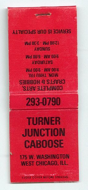 Matchbook, red cover with black print, advertising the Turner Junction Caboose at 175 W. Washington, West Chicago. The back reads "Complete Arts, Crafts & Hobbies" and give the business hours. Heads of the matches have been trimmed off.Lexicon
