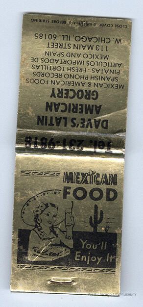 Matchbook, gold cover with black print, advertising Dave's Latin American Grocery, located in 113 Main Street, West Chicago. Back side has an image of a woman in a sombrero holding a plate of enchiladas, with cacti in the background. Matcheds have been trimmed off.Lexicon