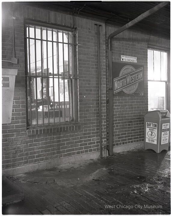 Negative, 4x5. Shows the Chicago and Northwestern Railway depot. Brick building, taken under an overhand. There is a payphone on the left edge, and a waste bin on the right edge. The left visible window is barred, the right is not. There is a rain gutter next the signs, near center of the image. Portrait orientation. (The image attached is the positive scan of the negative.)Photograph Details
