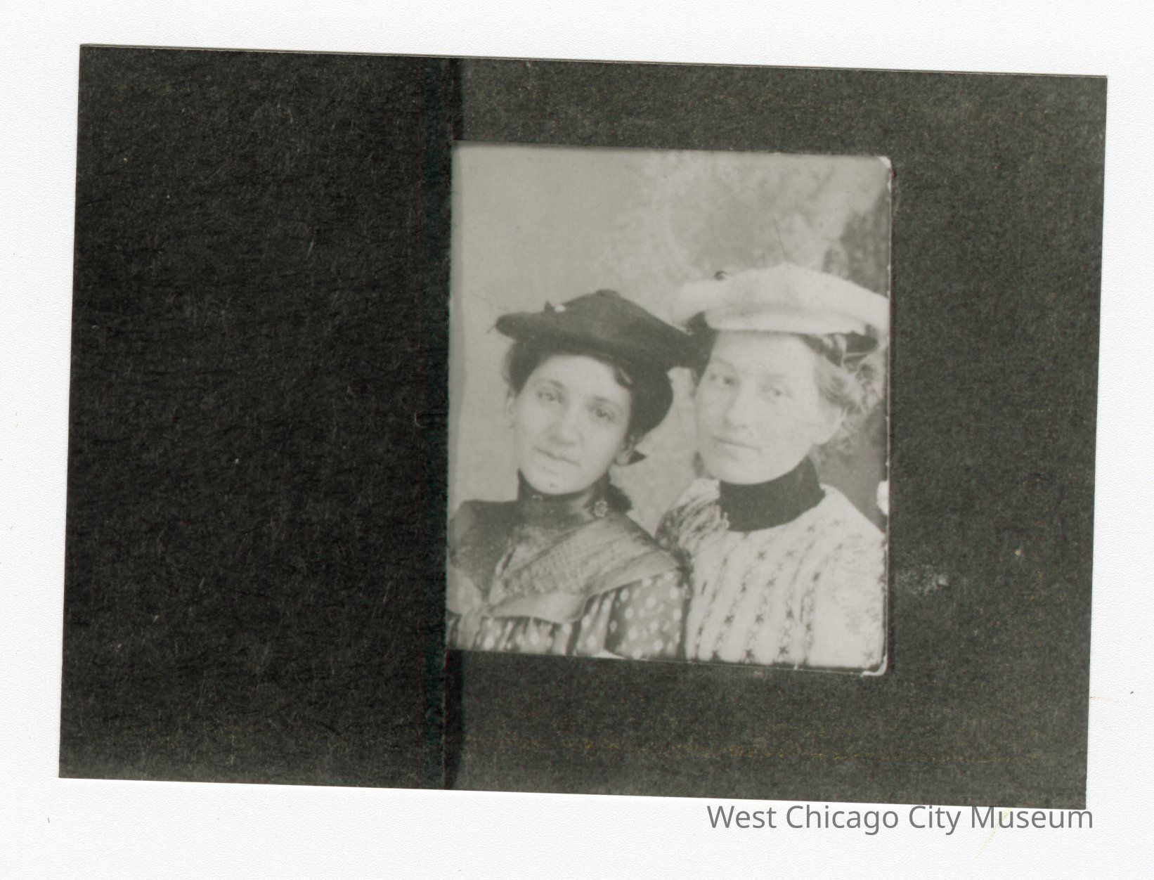 Black and white photo of a smaller photo of two women. Woman on right is wearing white hat and has black band around her neck. Woman on left is in black hat.