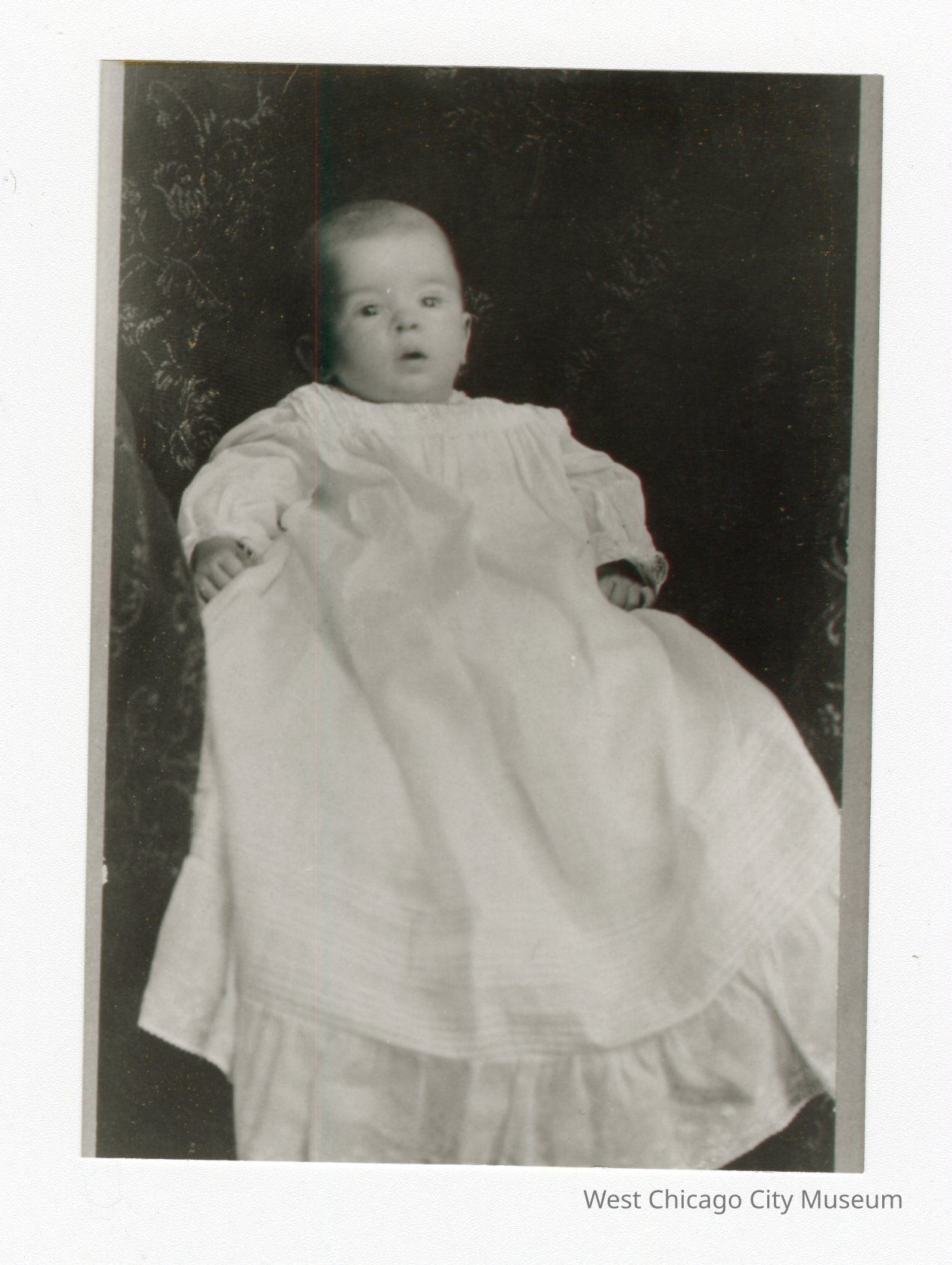 Black and white photo of baby in all white dress sitting. Only hands and head are visible.