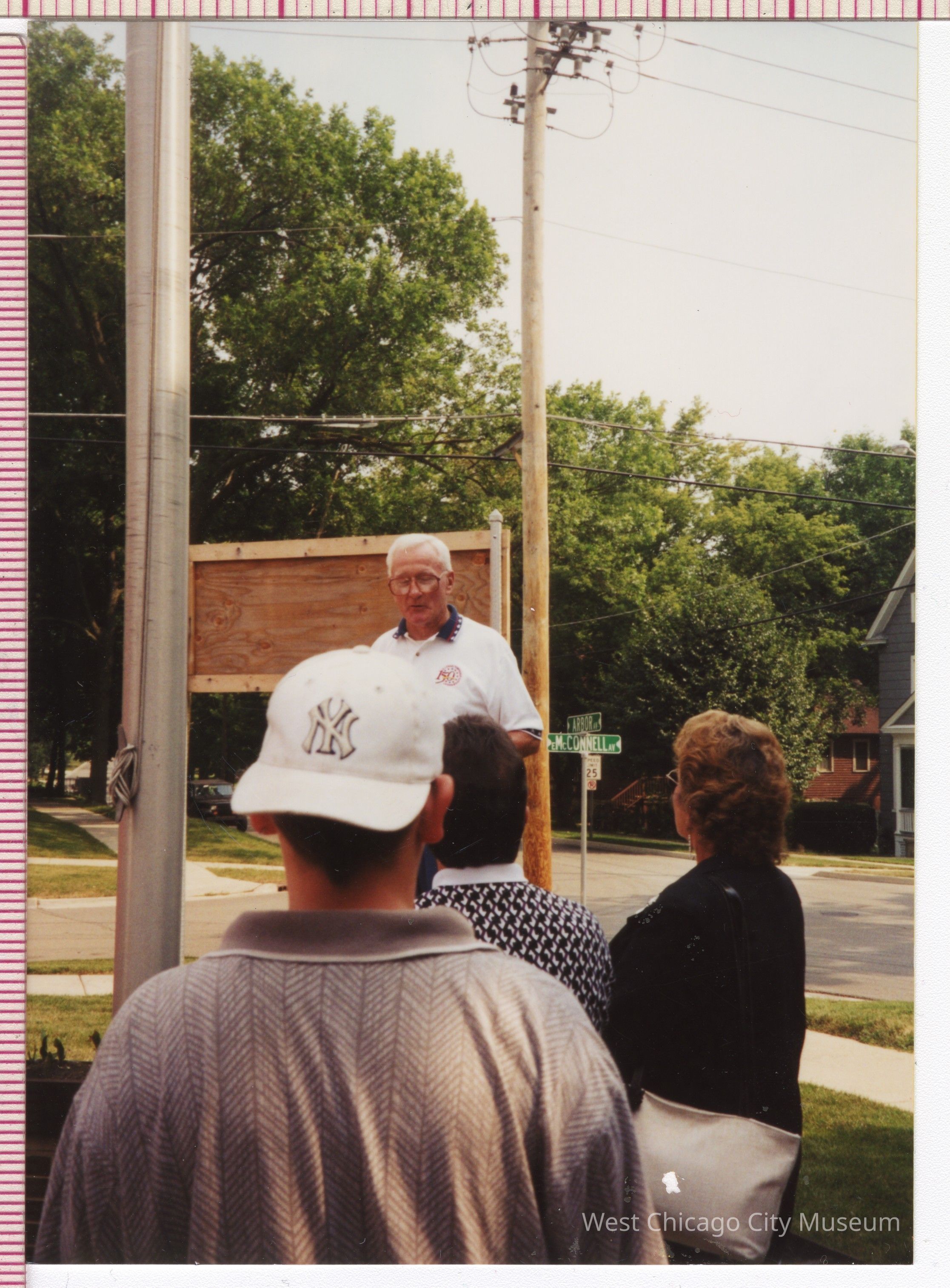 Photographs, color, Winfield Township Celebration of 150 years, July 27, 2000, time capsule ceremony at Winfield Township offices, 130 Arbor Avenue, Supervisor Gerald Girardot addresses the public at the anniversary celebration. 3 1/2" w x 4 7/8" h.Photograph Details