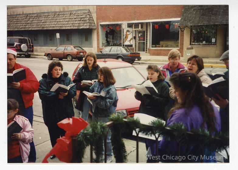 Photograph, color snapshot of a Christmas / Frost Fest Parade. Shows a choir singing on the sidewalk. The members are all ages, in casual winter clothes and singing from books. The photo is taken from the railing of the West Chicago City Museum, and the buildings across the street are visible (the American Legion at 123 Main street, and 129 Main Street, 131 Main Street). Printed on Kodak paper.