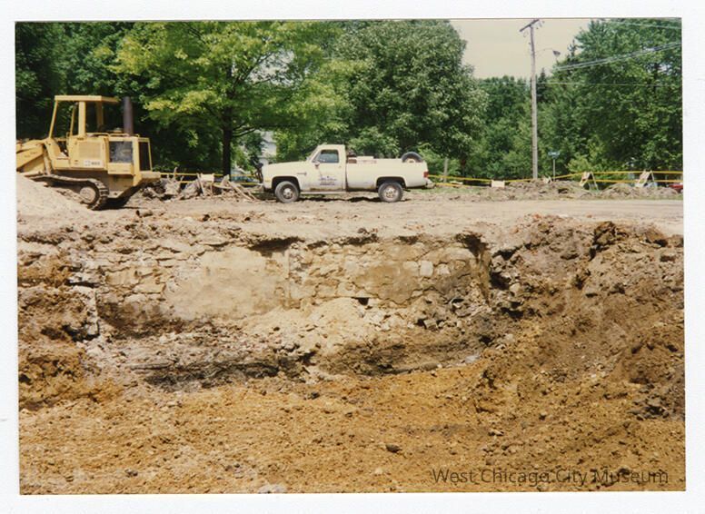Photograph, color, showing an excavation site for the West Chicago Fire Station. Photo shows a depression which is lined with stone - possibly a basement? There is a yellow bulldozer and white truck behind it. Lots of trees in the background. Printed on Kodak Paper. 3.5 x 5"