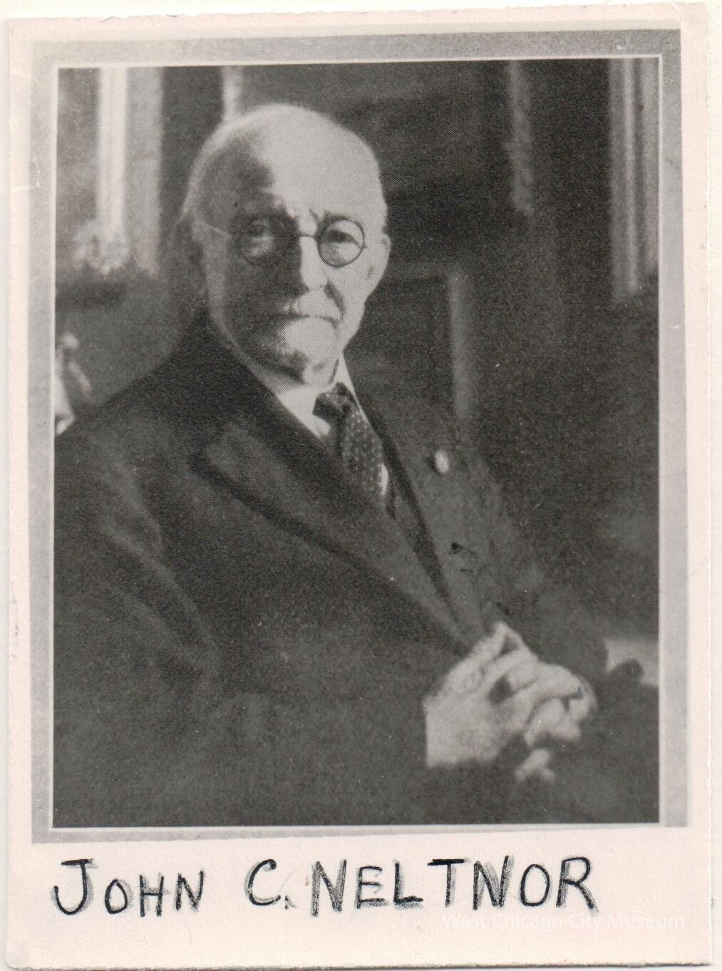 Photograph, John C. Neltnor, b/w 3-1/4" x 4-1/2". Shows an older man, seated in a chair o what appears to be a parlor or living room; there is a fireplace behind him. He has short grey hair, and round framed glasses. He is wearing a dark three piece suit with a dark tie with polka dots. He is angled to the right. At the bottom on the photo, in pen, it reads "JOHN C. NELTNOR"Photograph Details