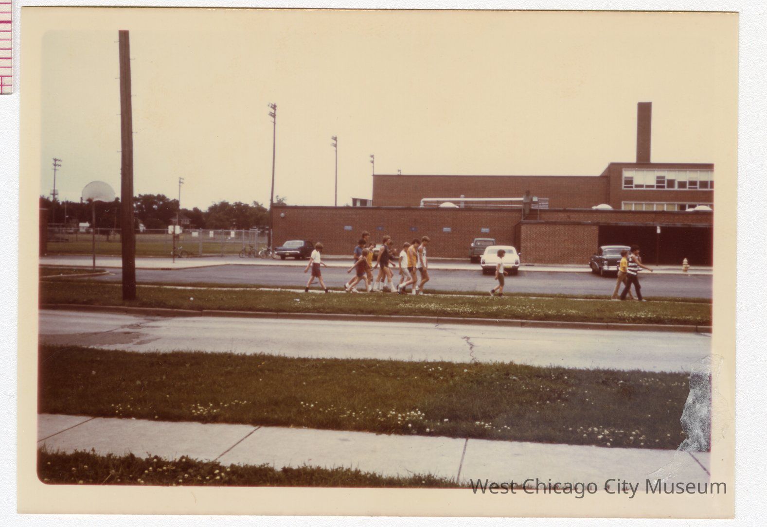 Photograph, colored snapshot, showing the 500 Mile Club walking on Ann Street, next to the High School. The group appears to be made mostly of children, and the are mostly wearing shorts and short sleeved shirts. Photo taken from opposite side of Ann Street