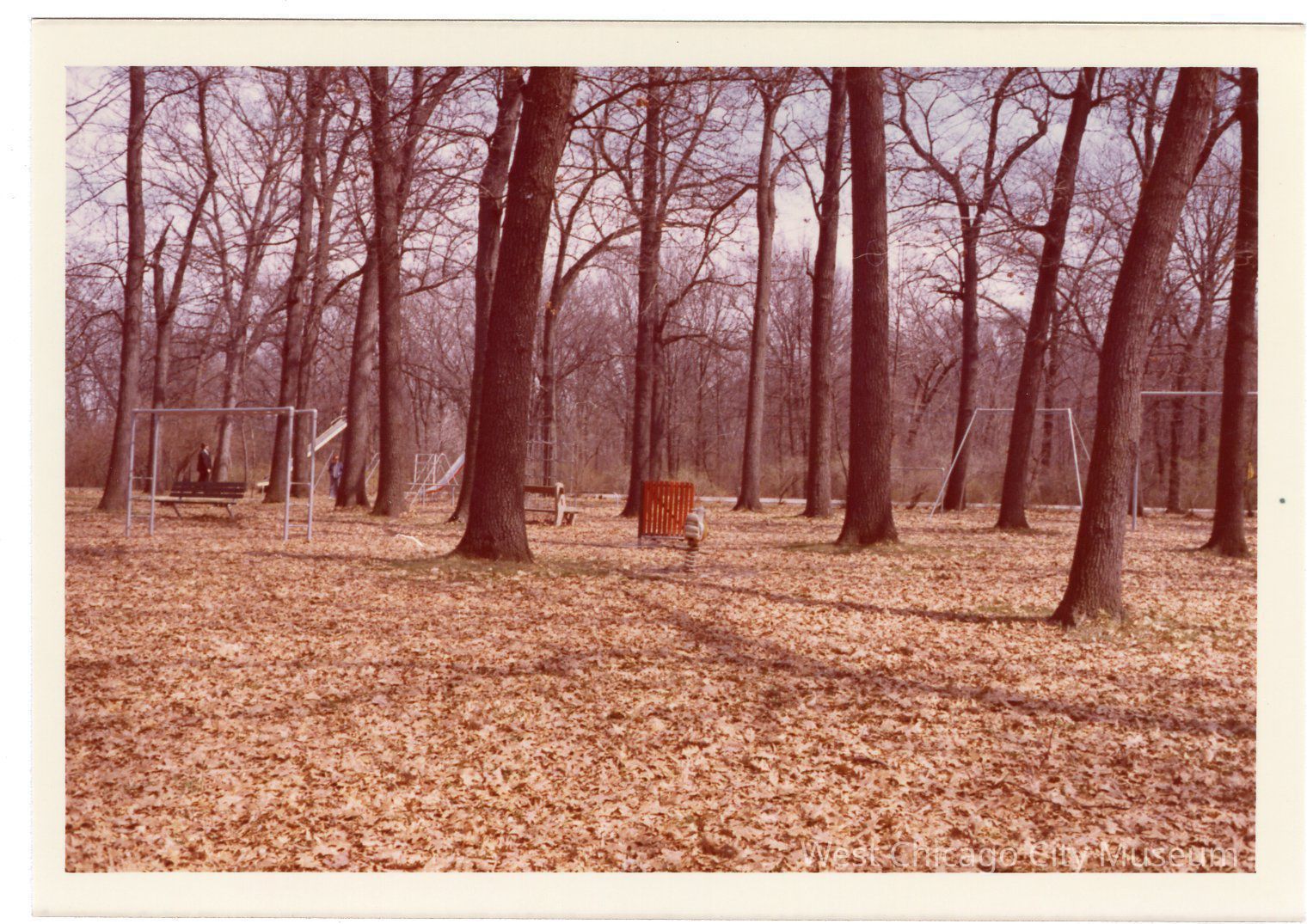 Photograph, colored snapshot, showing the playground at Reed Keppler Park. Center of the photo is a spring rider, and there are trees, benches, a red gate, swing sets ad a set of monkey bars. There are two people in the back left of the photo. The trees are bare and there are dried leaves on the ground.Photograph Details
