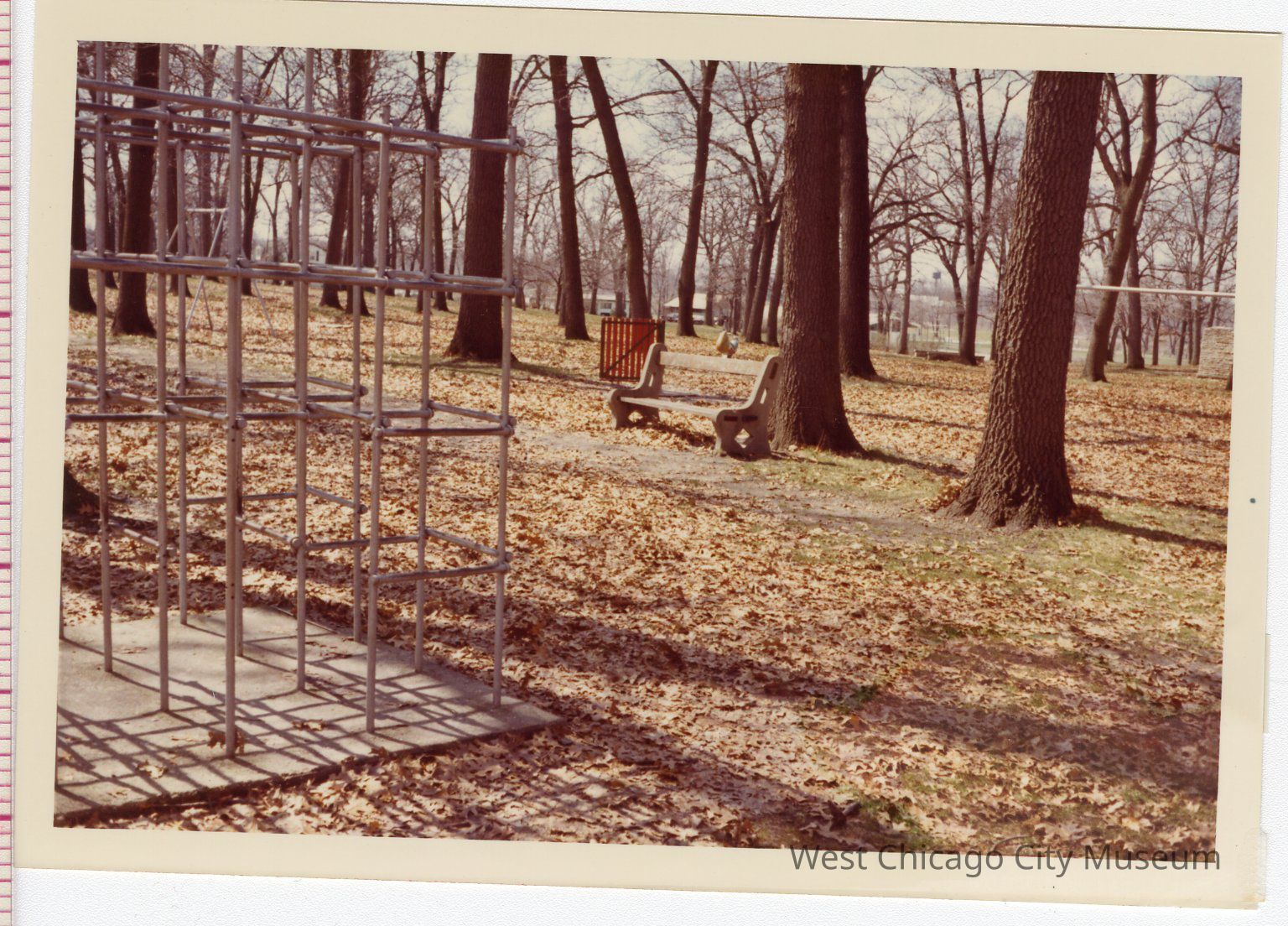 Photograph, colored snapshot, showing the playground at Reed Keppler Park. Left forefront is a climbing gym made of metal bars. There is a bench, a red gate (for unknown purpose) and a spring rider barely visible above the bench. The trees are bare and there are dried leaves on the ground.