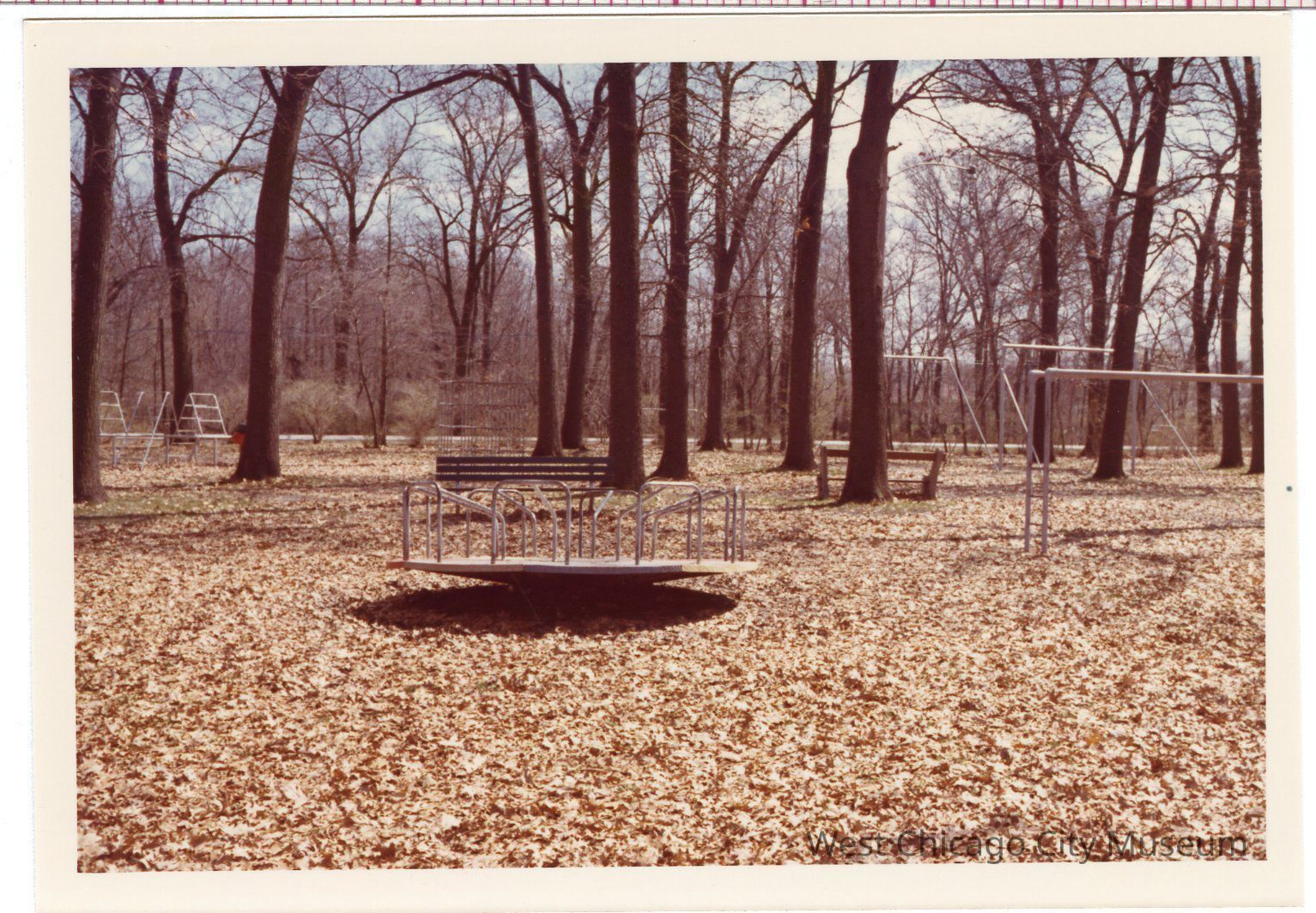 Photograph, colored snapshot, showing the playground at Reed Keppler Park. There are swing sets, climbing bars, benches and a merry-go round with metal bars. The trees are bare and there are dried leaves on the ground.