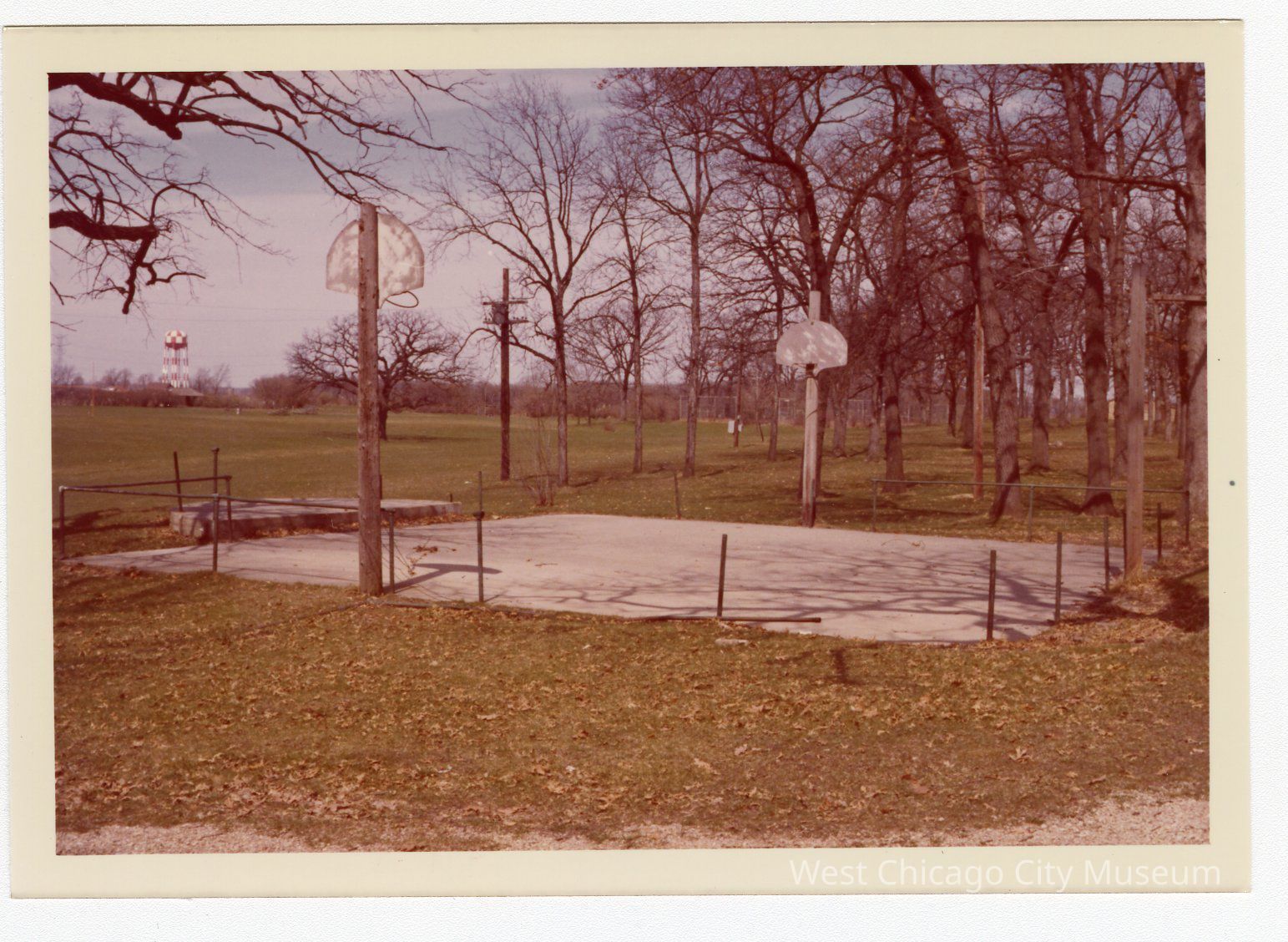 Photograph, colored snapshot, showing the "Hard surface area" at Reed Keppler Park. The hard surface pad has a partial fence around it with posts, and two basketball hoops. In the background left is a red and white checkered water tower. The trees are bare and there are dried leaves on the ground.