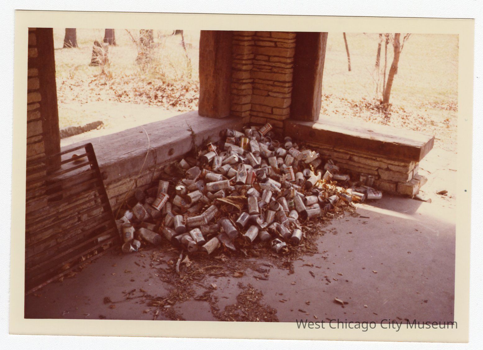 Photograph, colored snapshot, showing a close up of a pile of beer cans in the corner of the stone pavilion at Reed Keppler Park. Both Budweiser and Pabst Old Style are visible. There a grate (possibly from a grill) leaning up against the wall near the cans, and dried leaves on the cement floor. Outside, it's sunny. The trees are bare and there are dried leaves on the ground.