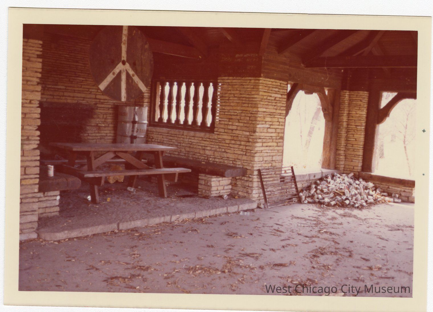 Photograph, colored snapshot, showing the interior of the stone pavilion at Reed Keppler Park. There is a large pile of beer cans in the corner, and a large circular peace sign hung in front of the fireplace area. The trees are bare and there are dried leaves on the ground. There are dried leaves on the ground, and a grate (possibly from a grill) leaning up against the wall near the cans.