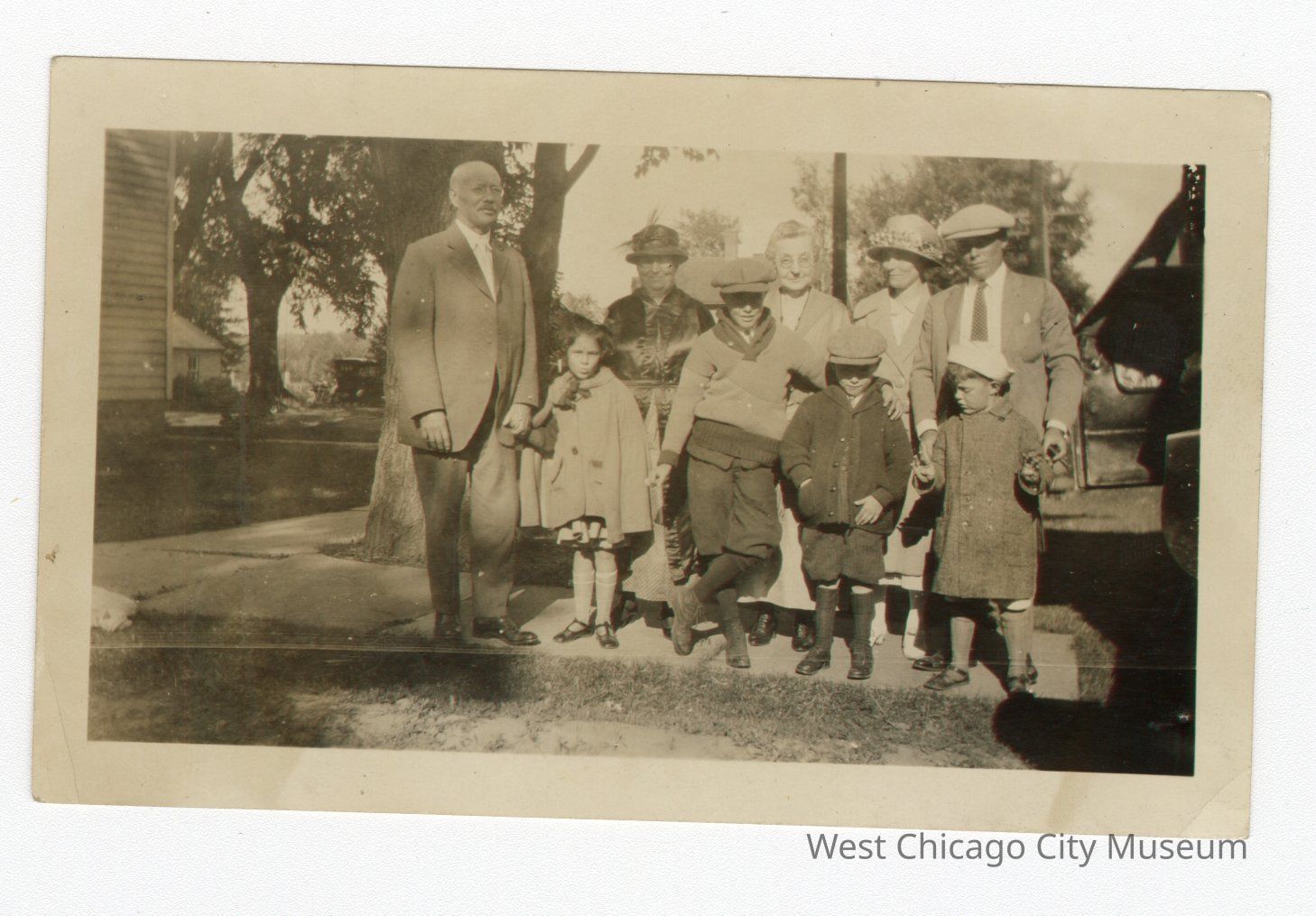 Black and white photograph with white edge. 9 people, man on left then to the right two rows of four. Man in suit holding hand of girl in front beside him. All in hats except for three. Three children in front row wearing knee high stockings. Houses and trees in background.Collection