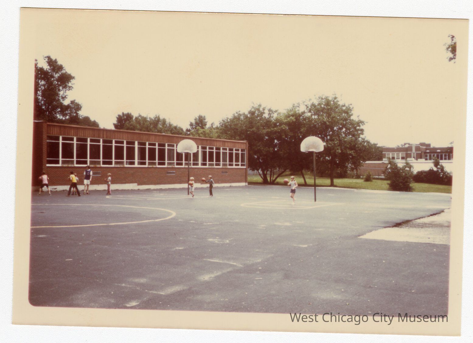 Photograph, colored snapshot, shows a group children playing shooting hoops on a large basketball court. There is a 1 story brick school to the left back of photo, Lincoln. The West Chicago Community high school is in the background, far right. In pencil on back is "L". Note on envelope reads "West Chicago Park District" and "pd for by the Park District - school Park district agreement"