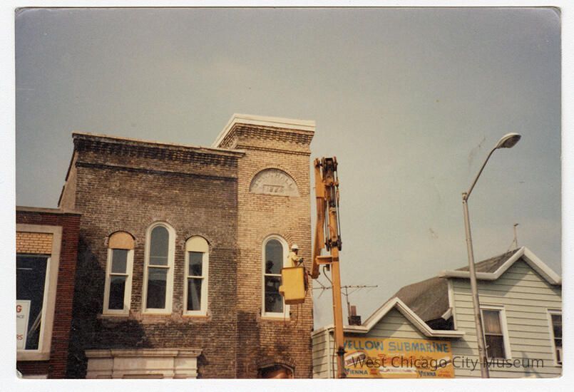 Photograph, color, portrait orientation. May 1985. The photo shows the upper part of 132 Main Street, old Turner Junction City Hall, and the 1 story building next door (130 Main Street). The brick on the city hall building is dark and there is a man high in a bucket lift power washing the building. The photo was taken early in the restoration of the building. The building to the left has siding, and a sign for the shop "Yellow Submarine". 3.5 x 4.5 inches. Back has making in pen "Former Town Hall West Chicago May 1985".