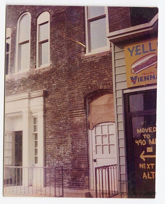 Photograph, color, portrait orientation. The photo shows part of 132 Main Street, old Turner Junction City Hall, and the 1 story building next door (130 Main Street). The brick on the city hall building is dark and there is a coving over the transom of the small door on the right (middle of the photo). The photo was taken early in the restoration of the building. The shop to the left is the "Yellow Submarine". The business has a sign on the glass door that reads "moved to 490 Main" with an arrow to the left. 3.5 x 4.5 inches, dates to before May 1985.